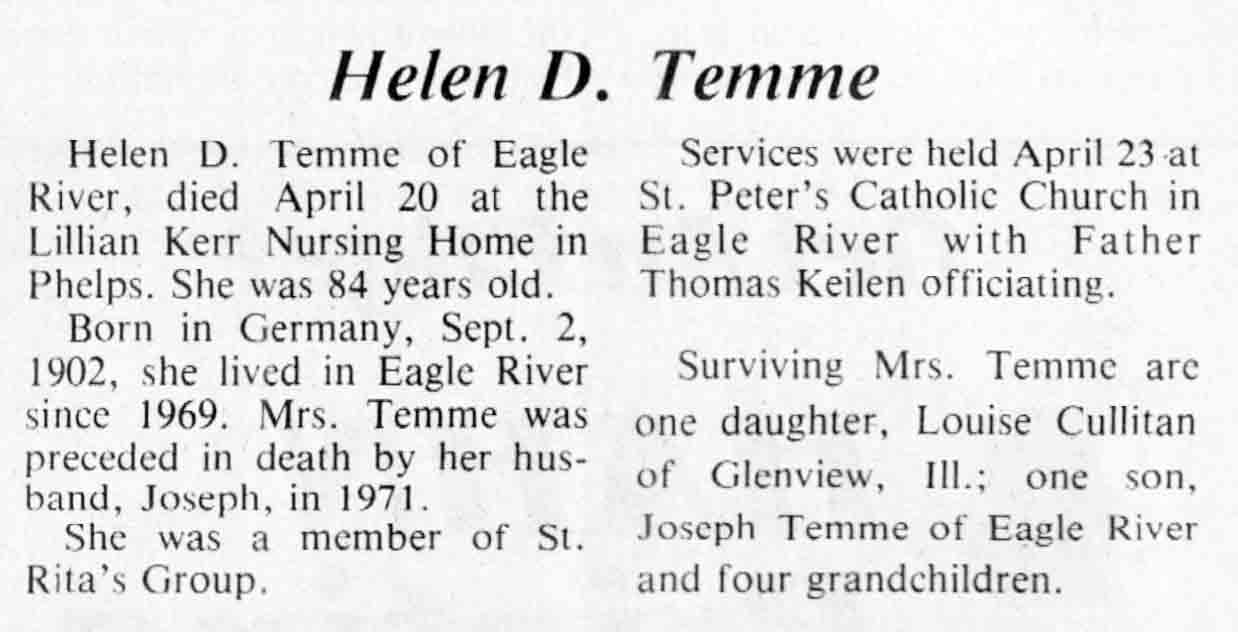 | Temme | Helen D | 02 Sep 1902 | 20 Apr 1987 | V N-R | 29 Apr 1987 | 4 |
