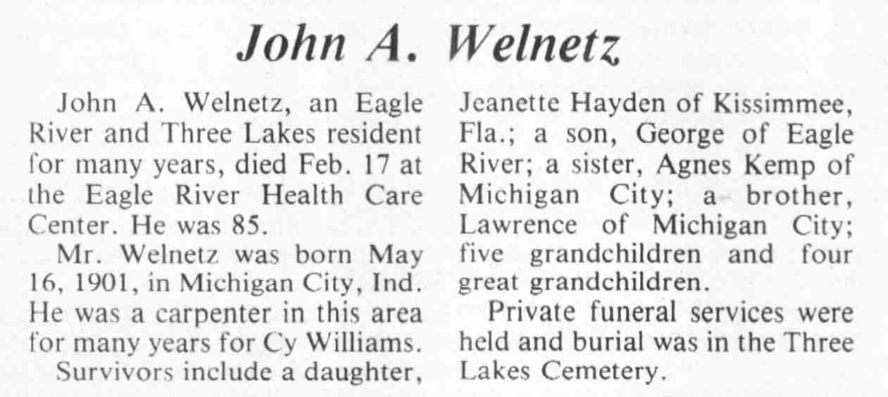 | Welnetz | John A | c 1902 | 17 Feb 1987 | V N-R | 25 Feb 1987 | 4 |