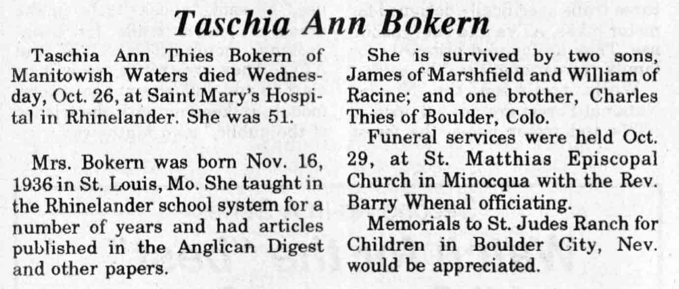 | Bokern | Taschia Ann (Thies) | 16 Nov 1936 | 26 Oct 1988 | V N-R | 02 Nov 1988 | 4 |