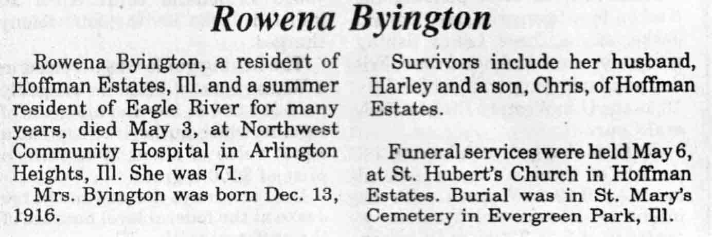 | Byington | Rowena | 13 Dec 1916 | 03 May 1988 | V N-R | 18 May 1988 | 4 |