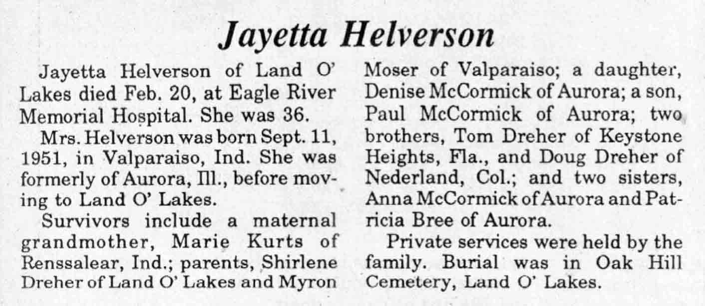 | Harman | Sandra L (Grieson) | c 1941 | 27 Sep 1988 | V N-R | 05 Oct 1988 | 4 |