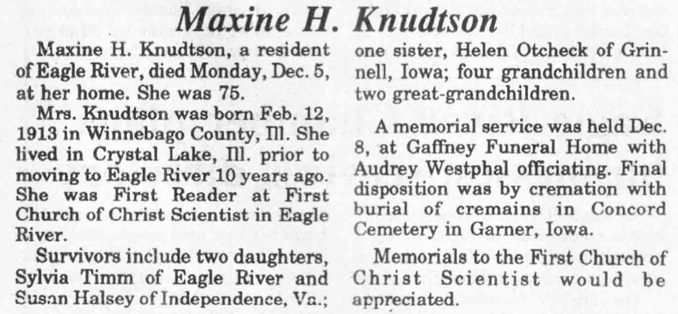 | Christensen | Katherine (Vance) | 01 Oct 1918 | 26 Dec 1988 | V N-R | 28 Dec 1988 | 4 |