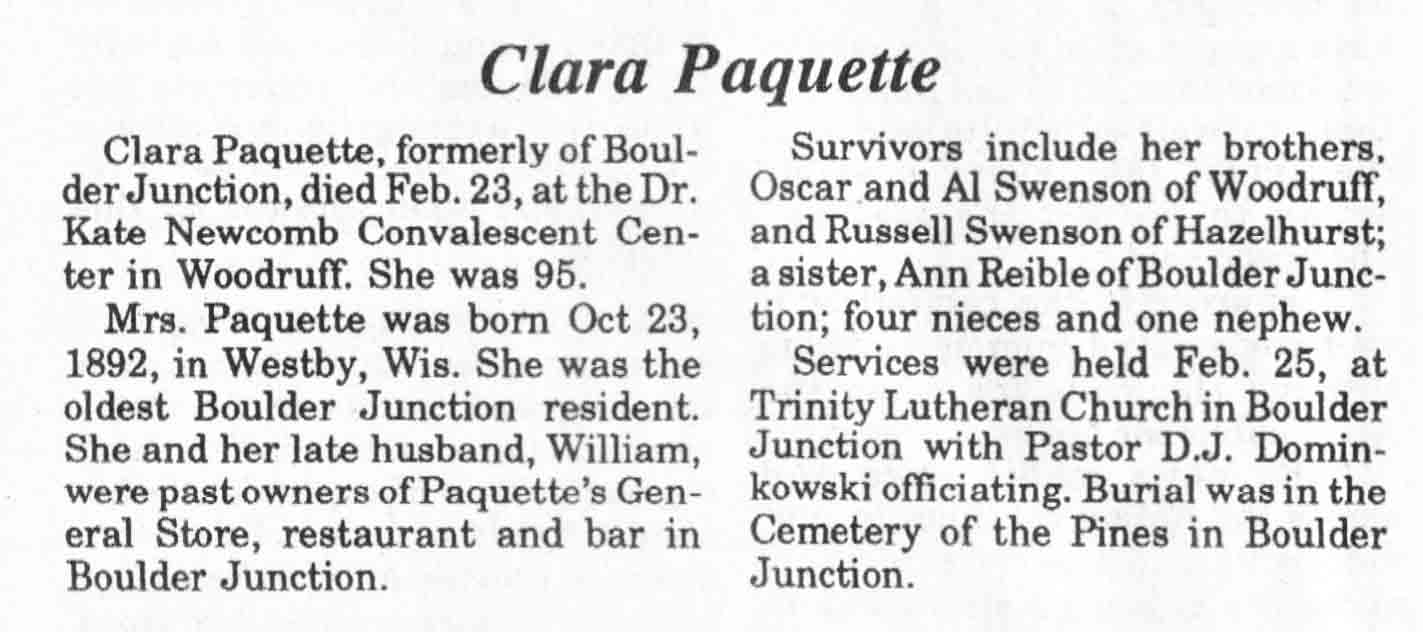 | Paquette | Clara (Swenson) | 23 Oct 1892 | 23 Feb 1988 | V N-R | 09 Mar 1988 | 4 |