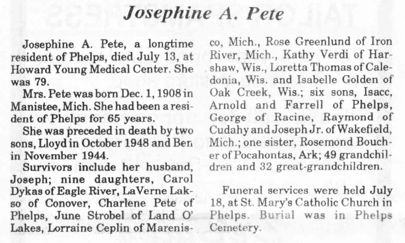 | Pete | Josephine A | 01 Dec 1908 | 13 Jul 1988 | V N-R | 20 Jul 1988 | 4 |