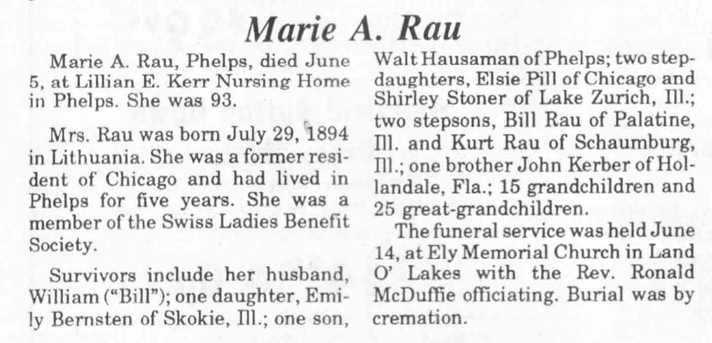 | Rau | Marie A (Kerber) | 29 Jul 1894 | 05 Jun 1988 | V N-R | 15 Jun 1988 | 4 |