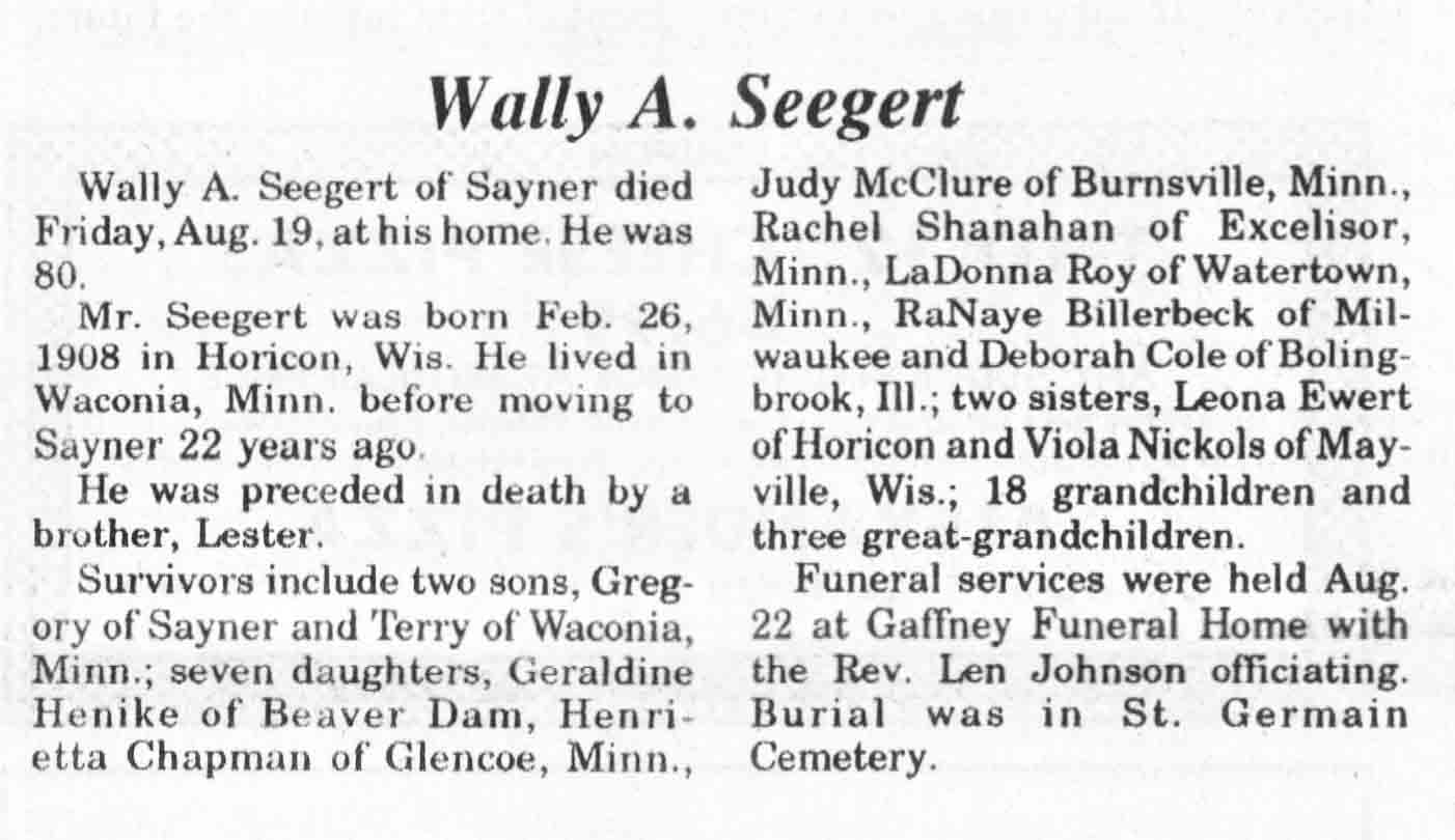 | Seegert | Wally A | 26 Feb 1908 | 19 Aug 1988 | V N-R | 24 Aug 1988 | 4 |