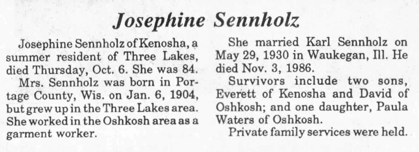 | Sennholz | Josephine | 06 Jan 1904 | 06 Oct 1988 | V N-R | 12 Oct 1988 | 4 |