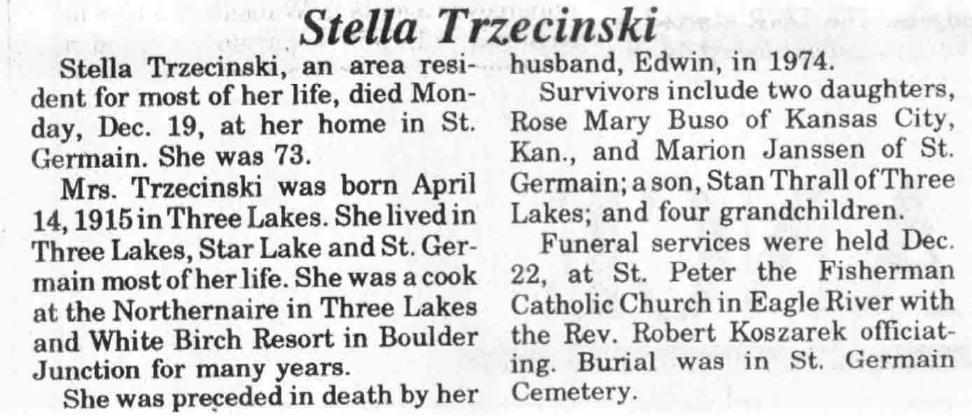 | Trzecinski | Stella | 14 Apr 1915 | 19 Dec 1988 | V N-R | 28 Dec 1988 | 4 |