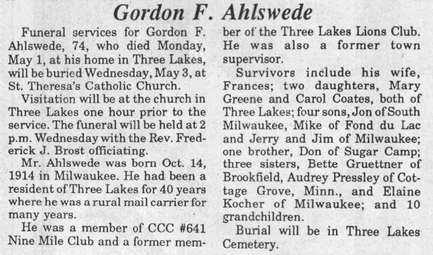 | Ahlswede | Gordon F | 14 Oct 1914 | 01 May 1989 | TLN | 03 May 1989 | 6 |