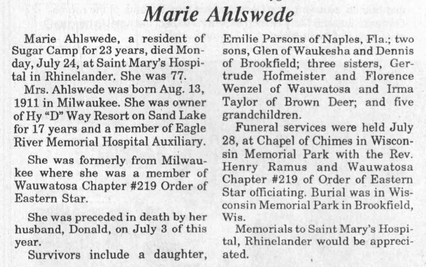 | Ahlswede | Marie | 13 Aug 1911 | 24 Jul 1989 | TLN | 02 Aug 1989 | 4 |
