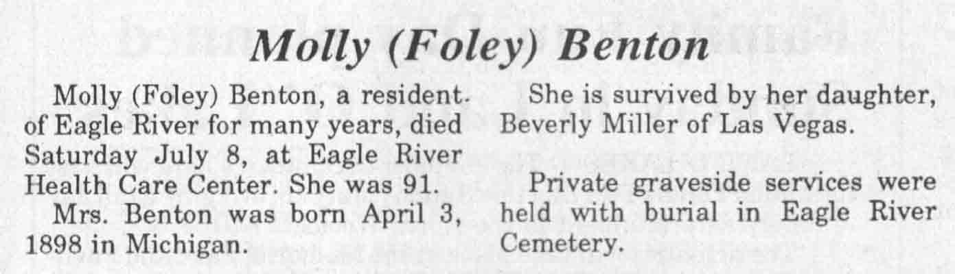 | Benton | Molly 'Foley' | 3 Apr 1898 | 08 Jul 1989 | TLN | 12 Jul 1989 | 4 |