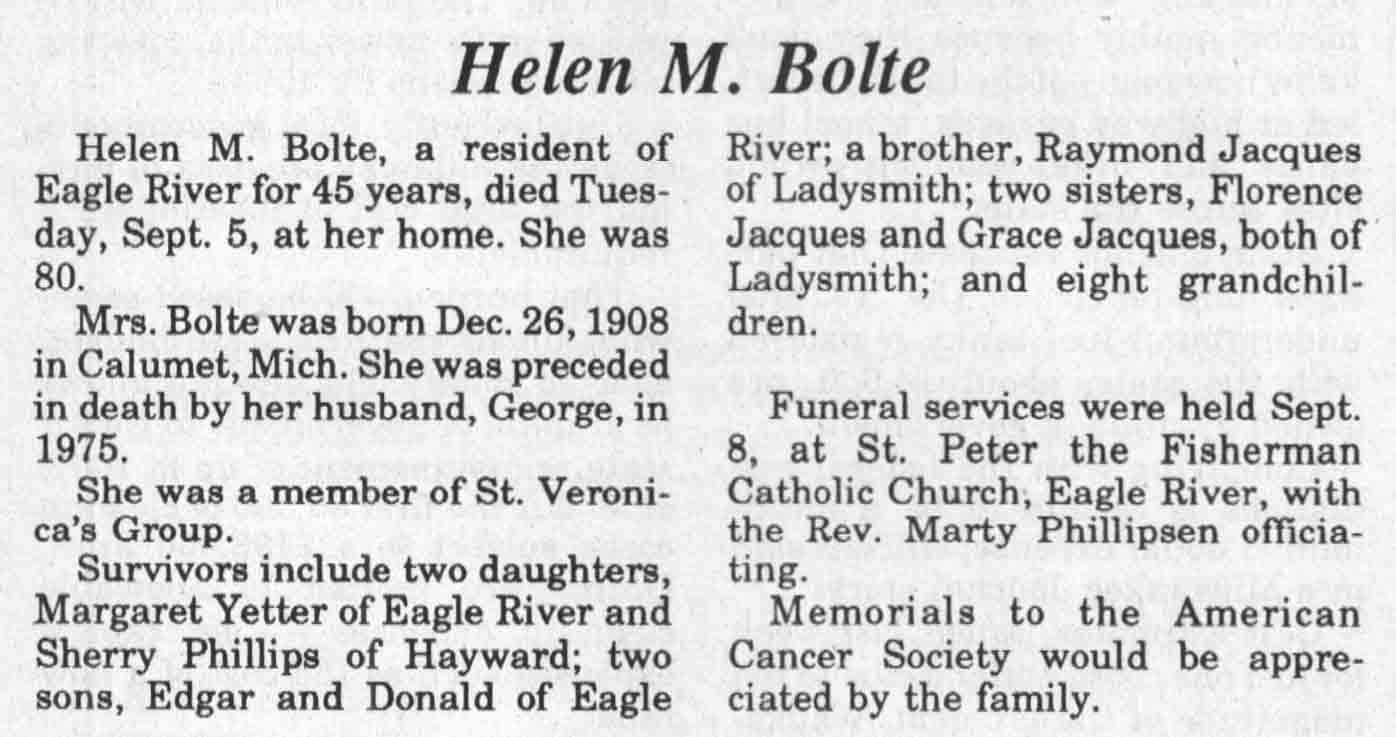| Bolte | Helen M | 26 Dec 1908 | 05 Sep 1989 | TLN | 13 Sep 1989 | 4 |