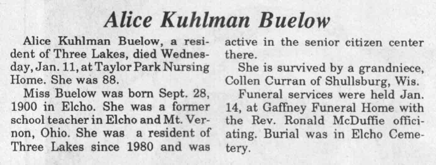 | Buelow | Alice Kuhlman | 28 Sep 1900 | 11 Jan 1989 | TLN | 18 Jan 1989 | 4 |