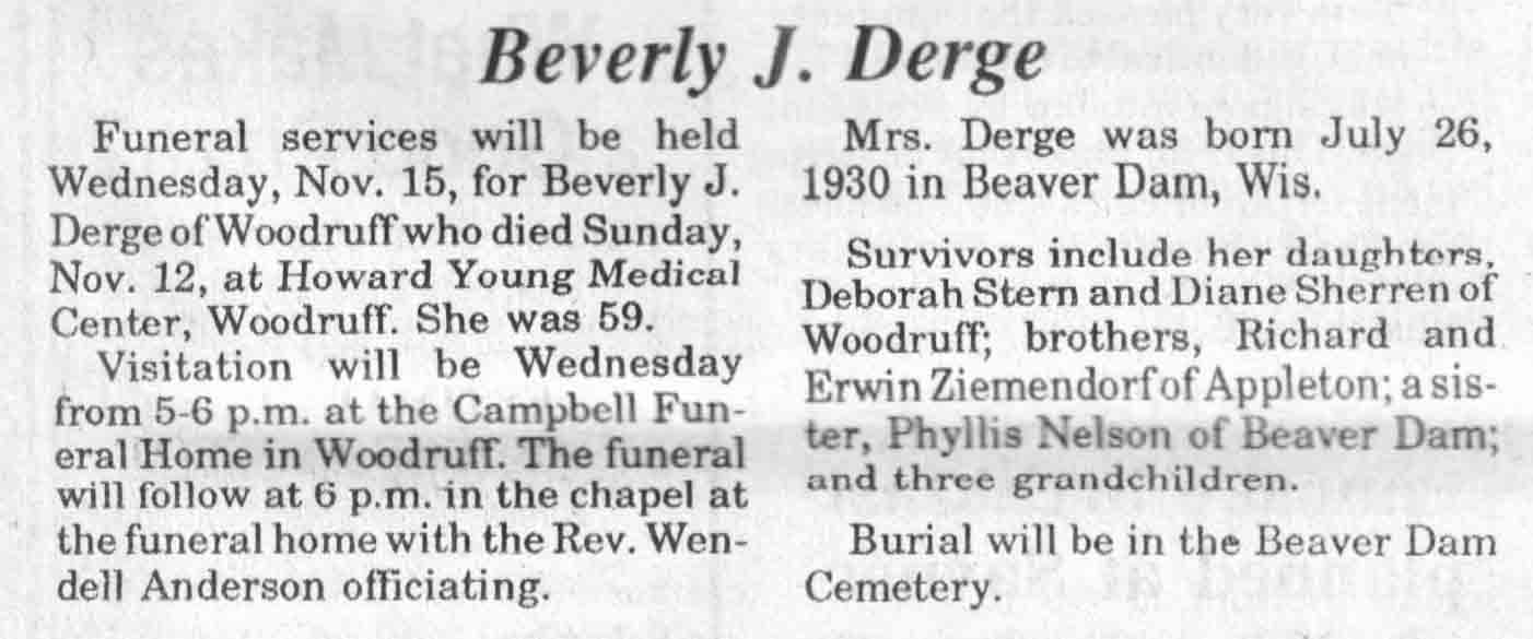 | Derge | Beverly J | 26 Jul 1930 | 12 Nov 1989 | TLN | 15 Nov 1989 | 4 |