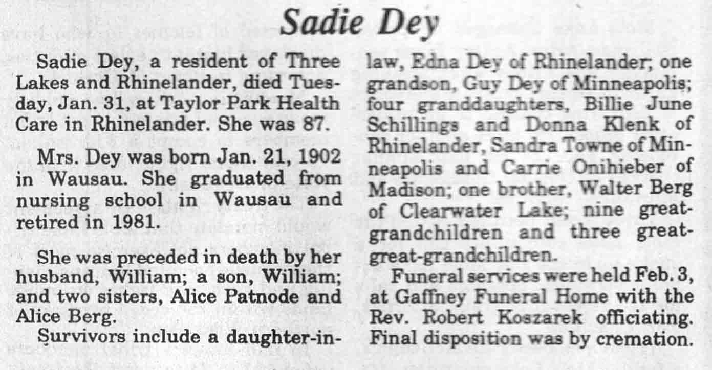 | Dey | Sadie | 21 Jan 1902 | 31 Jan 1989 | TLN | 08 Feb 1989 | 4 |