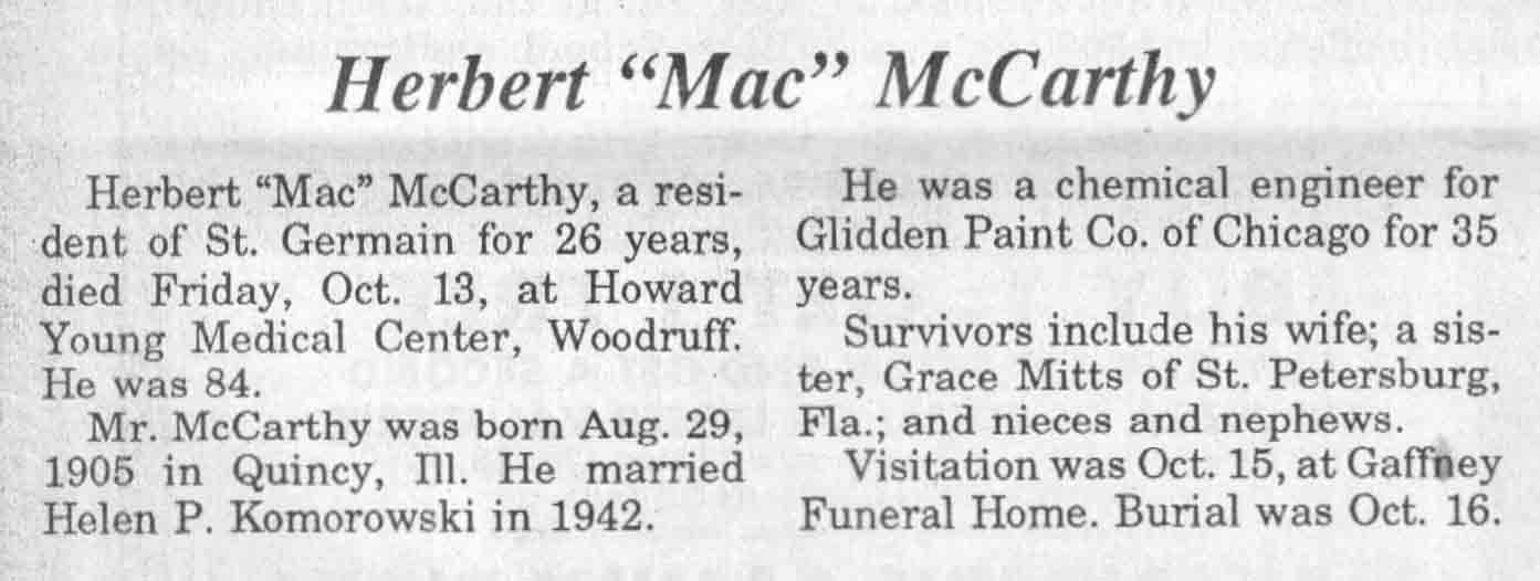 | McCarthy | Herbert 'Mac' | 29 Aug 1905 | 13 Oct 1989 | TLN | 18 Oct 1989 | 4 |