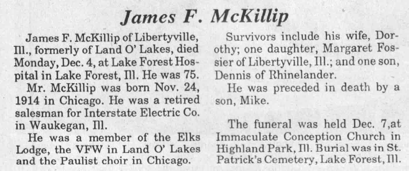 | McKillip | James F | 24 Nov 1914 | 04 Dec 1989 | TLN | 13 Dec 1989 | 4 |