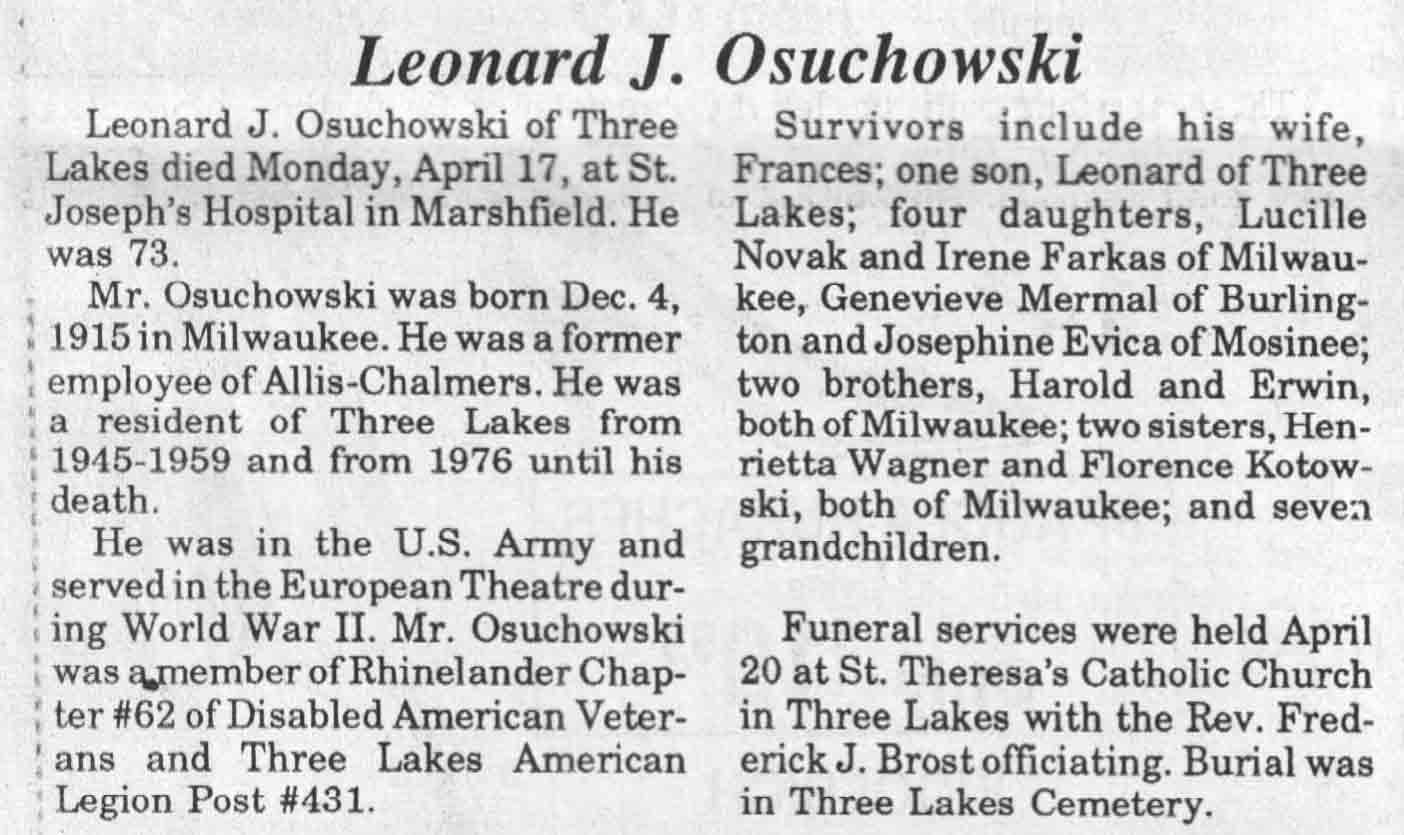 | Osuchowski | Leonard J #2 | 04 Dec 1915 | 17 Apr 1989 | TLN | 26 Apr 1989 | 4 |