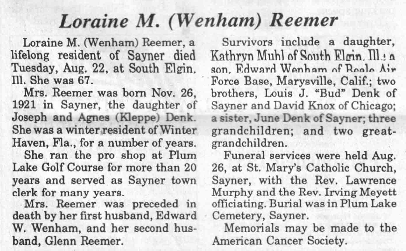 | Reemer | Loraine M (Wenham) | 26 Nov 1921 | 22 Aug 1989 | TLN | 30 Aug 1989 | 4 |