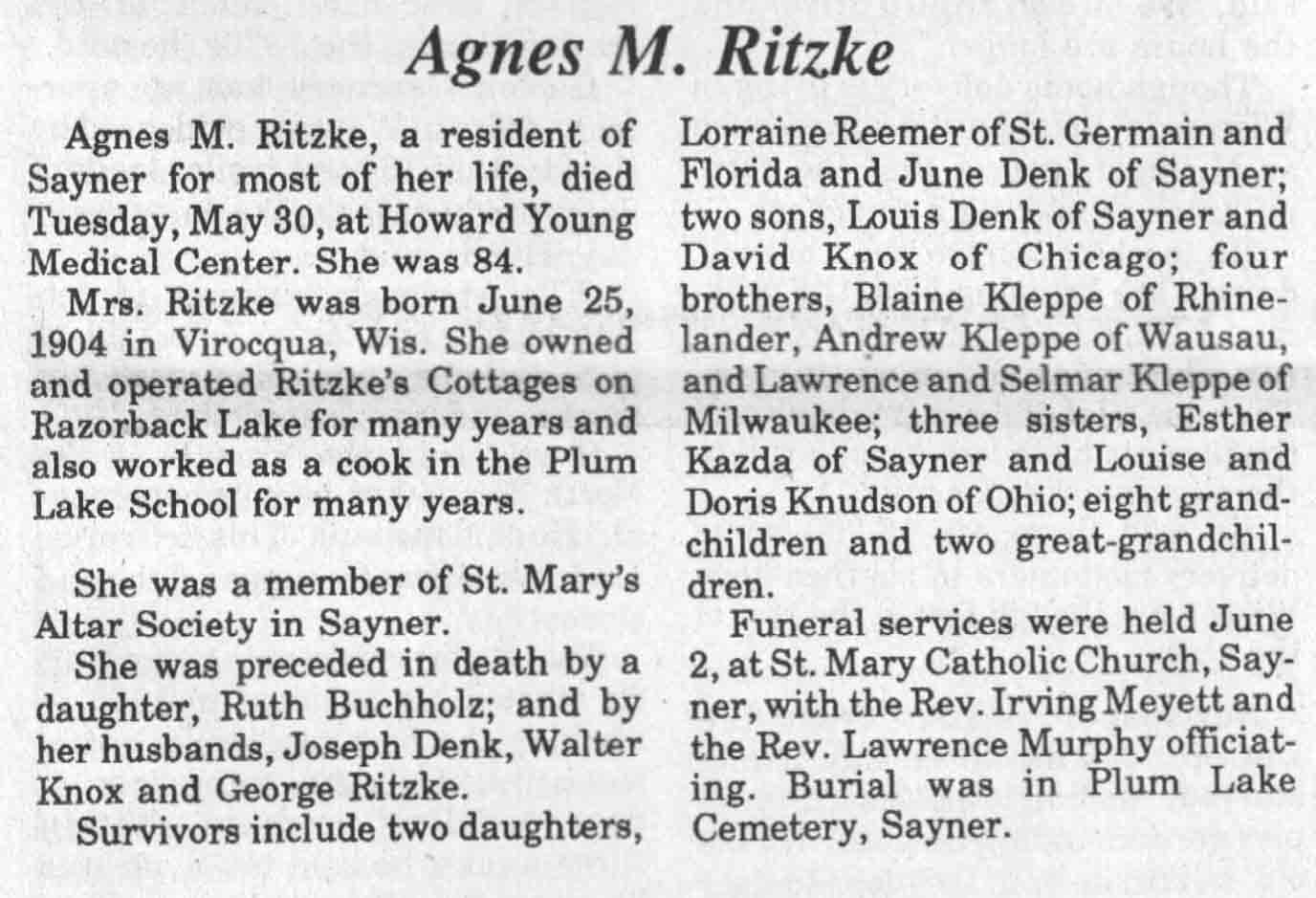 | Ritzke | Agnes M | 25 Jun 1904 | 30 May 1989 | TLN | 07 Jun 1989 | 4 |