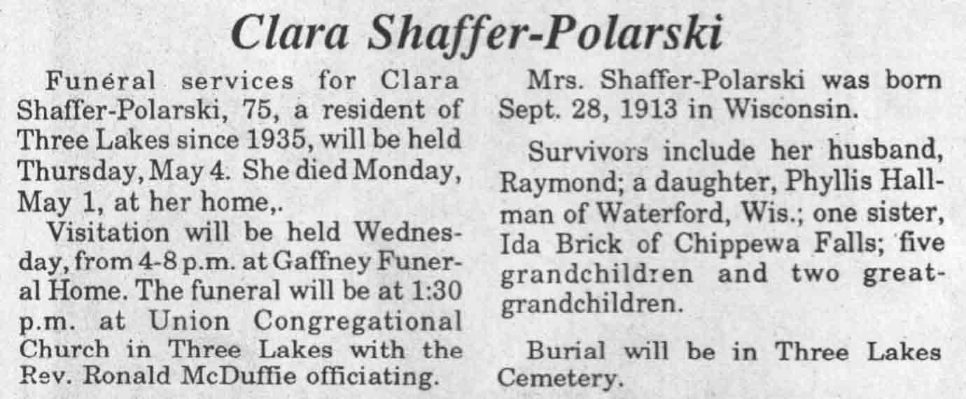 | Shaffer-Polarski | Clara | 28 Sep 1913 | 01 May 1989 | TLN | 03 May 1989 | 6 |