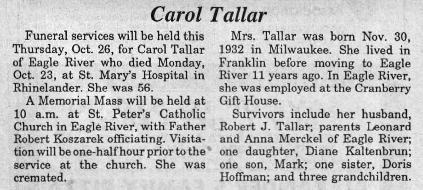 | Tallar | Carol | 30 Nov 1932 | 23 Oct 1989 | TLN | 25 Oct 1989 | 4 |