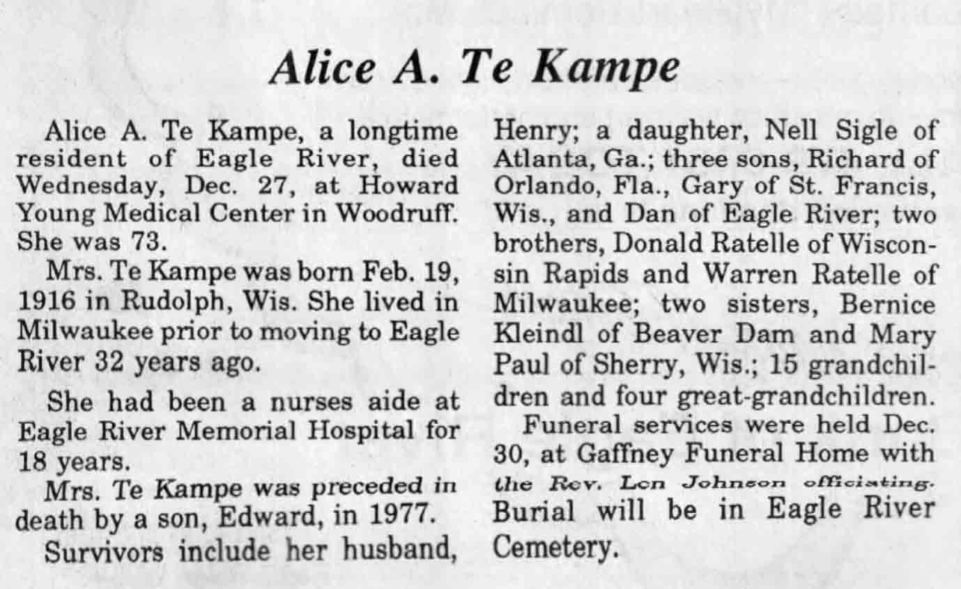 | Te Kampe | Alice A (Ratelle) | 19 Feb 1916 | 27 Dec 1989 | V N-R | 03 Jan 1990 | 4 |