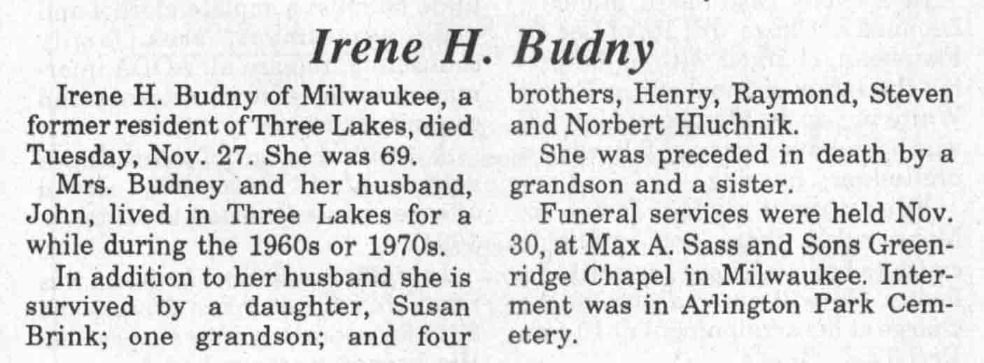 | Budny | Irene H (Hluchnik) | c 1921 | 27 Nov 1990 | V N-R | 05 Dec 1990 | 4 |