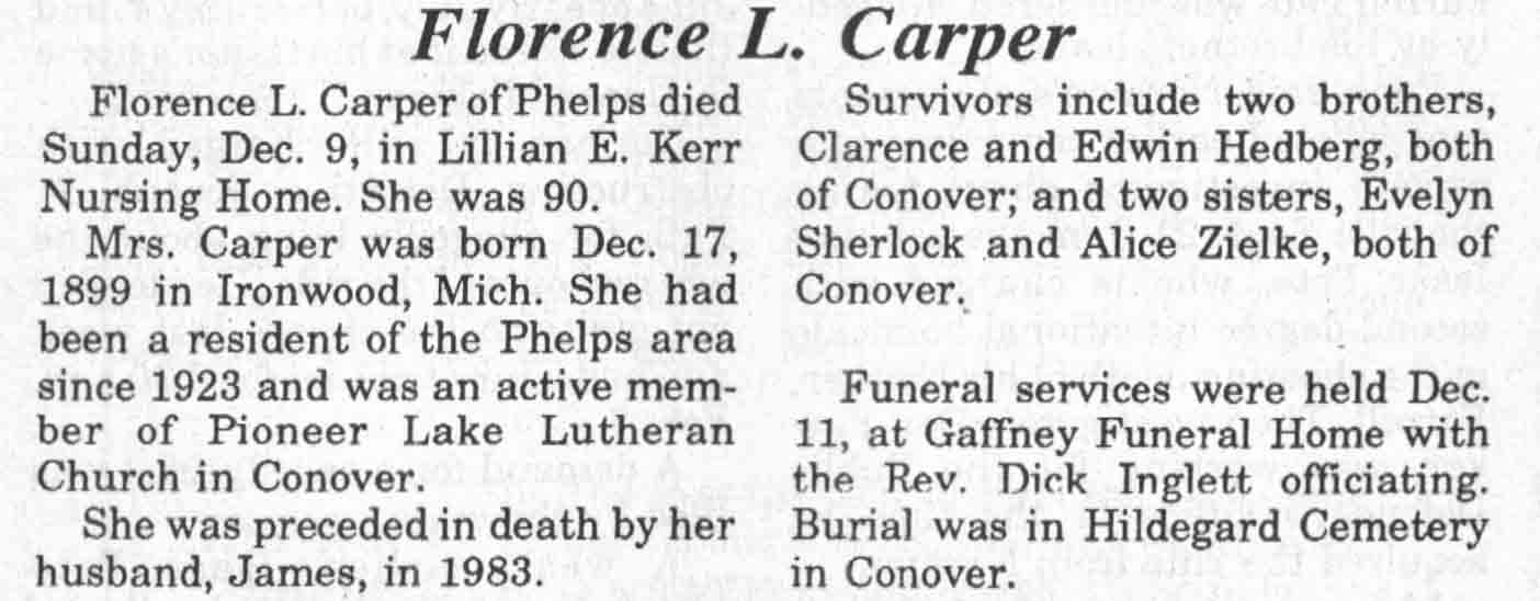 | Carper | Florence L (Hedberg) | 17 Dec 1899 | 09 Dec 1990 | V N-R | 12 Dec 1990 | 4 |