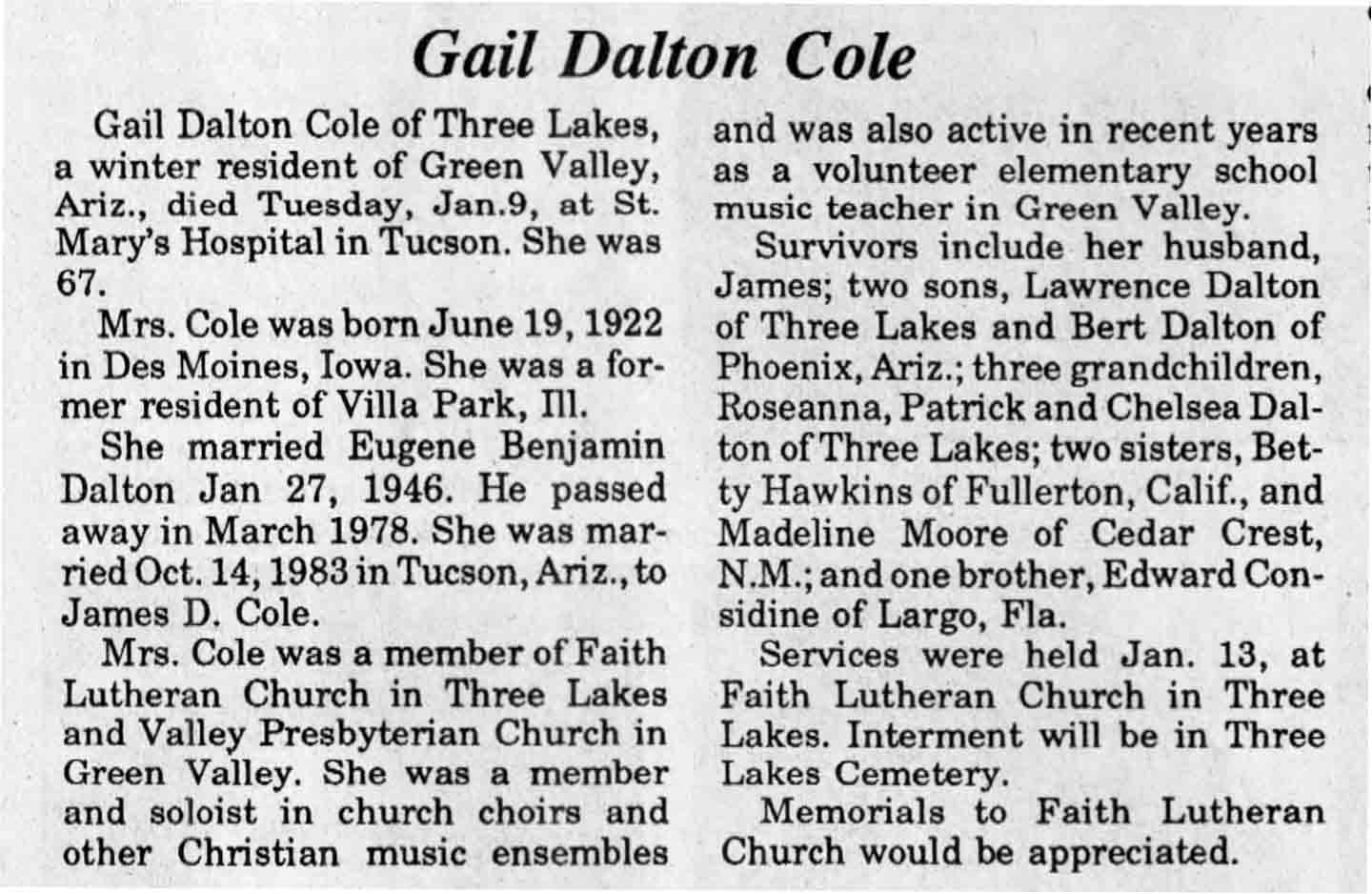 | Cole | Gail Dalton | 19 Jun 1922 | 09 Jan 1990 | V N-R | 17 Jan 1990 | 6 |