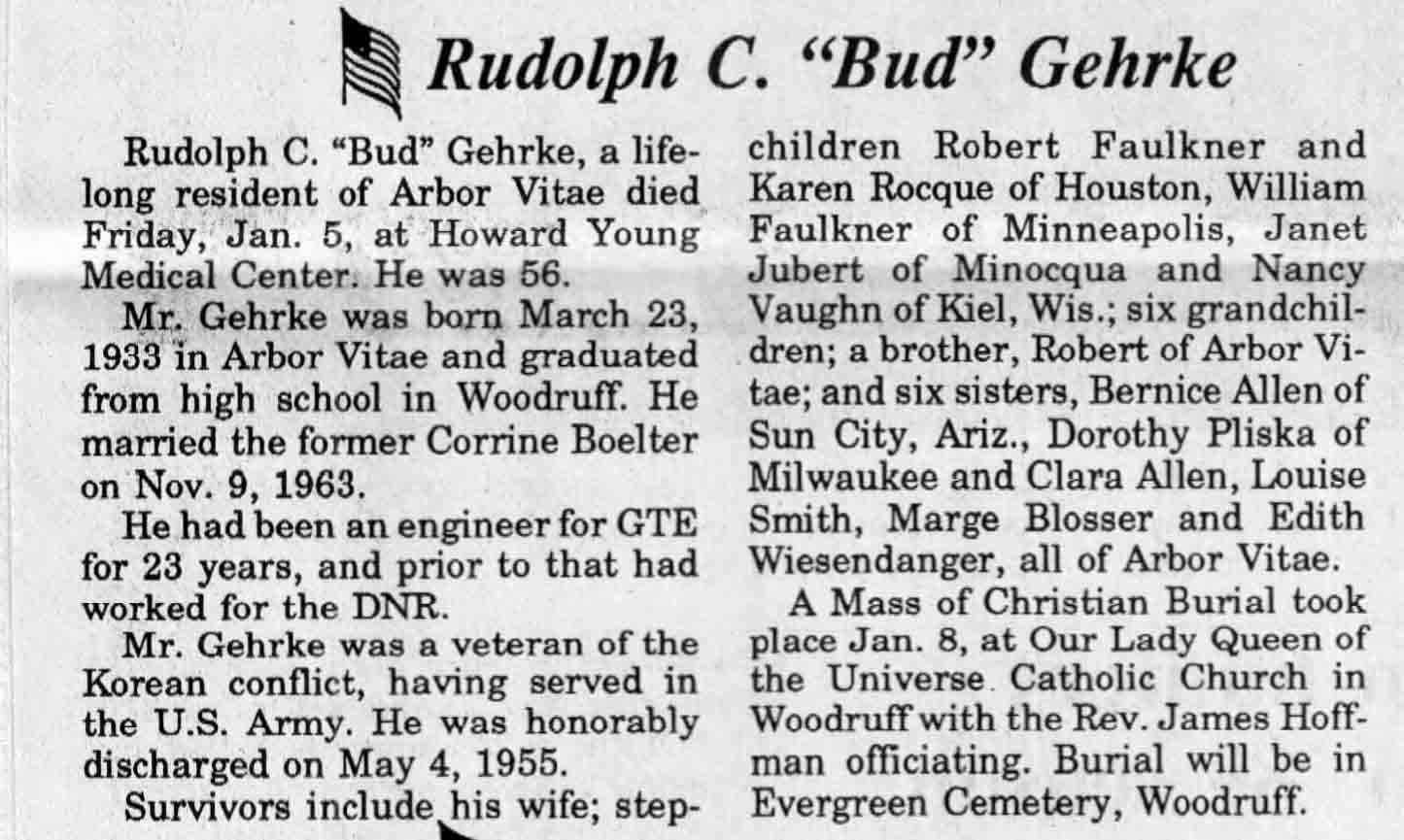 | Gehrke | Rudolph C 'Bud' | 23 Mar 1933 | 05 Jan 1990 | V N-R | 10 Jan 1990 | 4 |