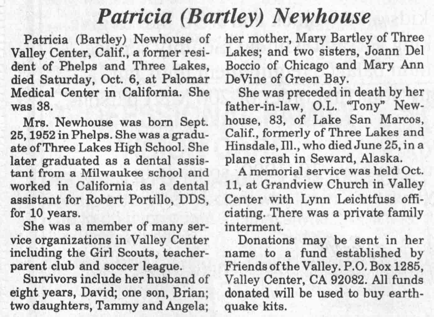 | Newhouse | Patricia (Bartley) | 25 Sep 1952 | 06 Oct 1990 | V N-R | 31 Oct 1990 | 4 |