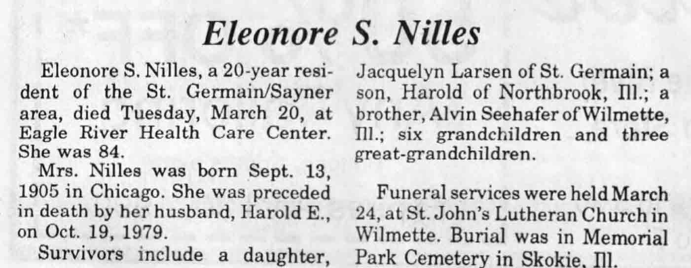 | Nilles | Eleonore S (Seehafer) | 13 Sep 1905 | 20 Mar 1990 | V N-R | 28 Mar 1990 | 4 |