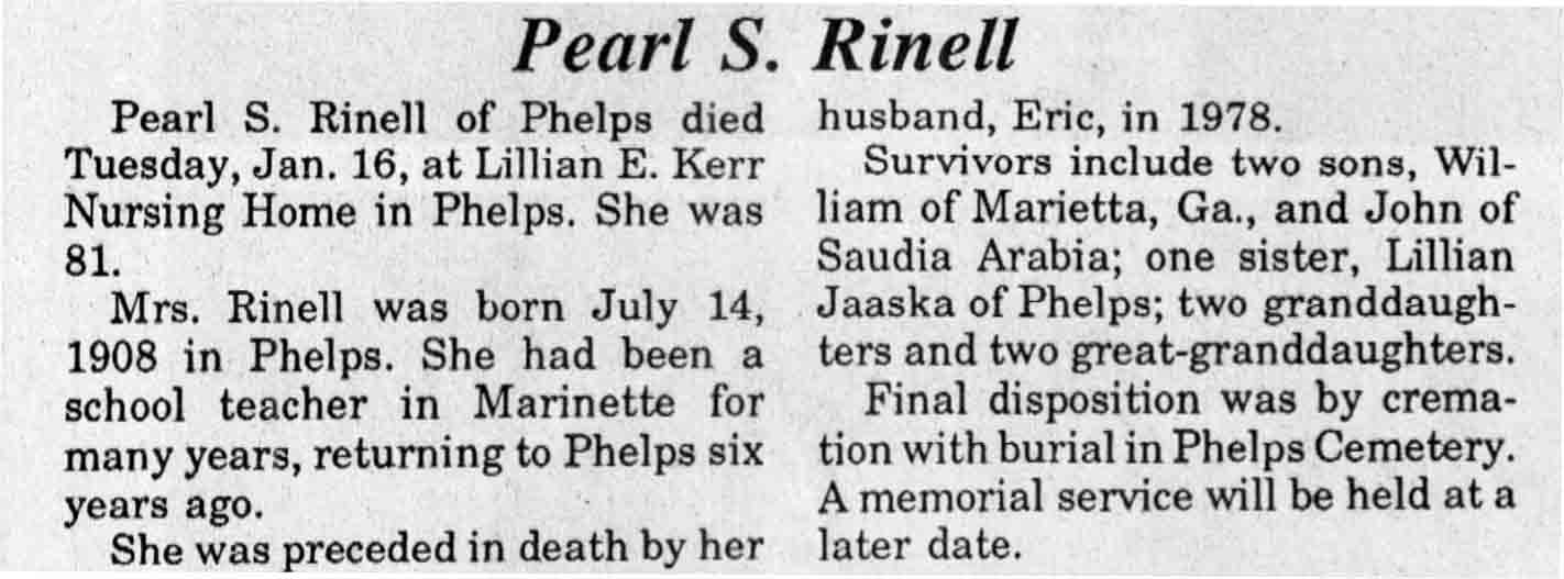 | Rinell | Pearl S | 14 Jul 1908 | 16 Jan 1990 | V N-R | 24 Jan 1990 | 4 |