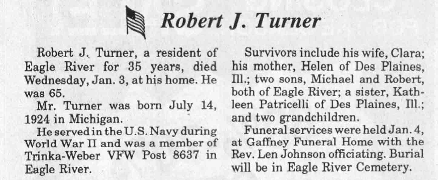 | Turner | Robert J | 14 Jul 1924 | 03 Jan 1990 | V N-R | 10 Jan 1990 | 4 |