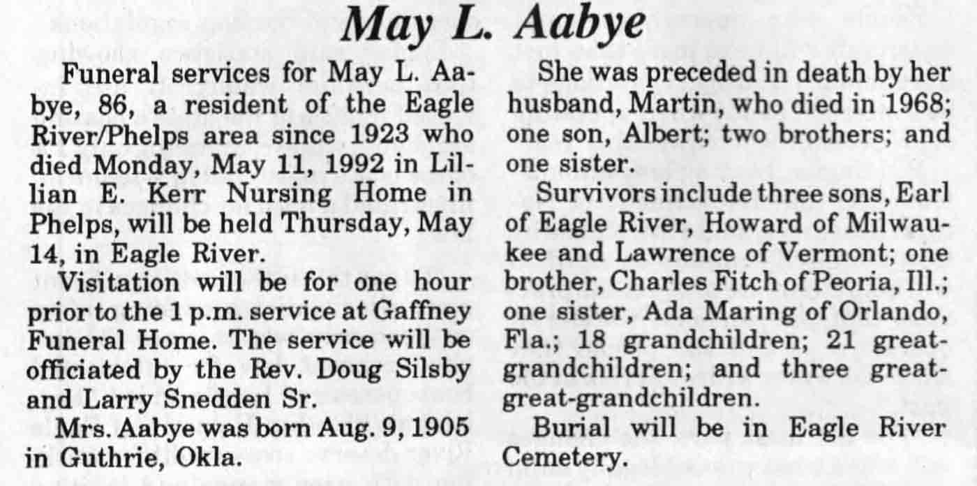 | Aabye | May L | 09 Aug 1905 | 11 May 1992 | V N-R | 13 May 1992 | 4 |