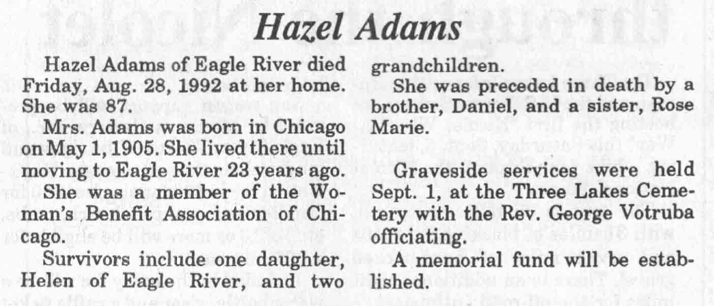| Adams | Hazel | 01 May 1905 | 28 Aug 1992 | V N-R | 02 Sep 1992 | 4 |