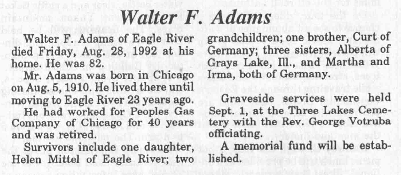 | Adams | Walter F | 05 Aug 1910 | 28 Aug 1992 | V N-R | 02 Sep 1992 | 4 |