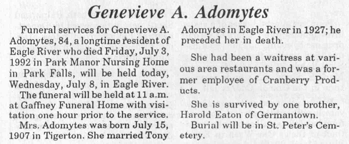 | Adomytes | Genevieve A | 15 Jul 1907 | 03 Jul 1992 | V N-R | 08 Jul 1992 | 4 |