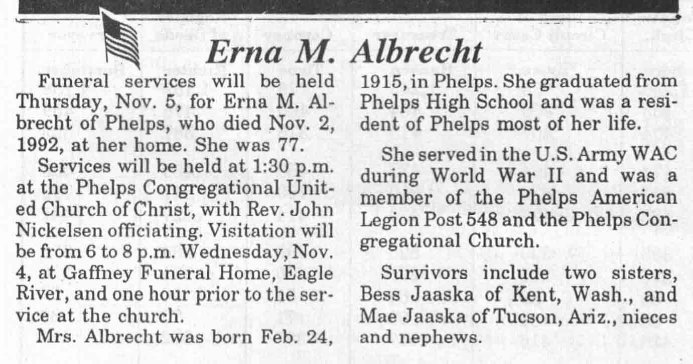 | Albrecht | Erma M | 24 Feb 1915 | 02 Nov 1992 | V N-R | 04 Nov 1992 | 4 |