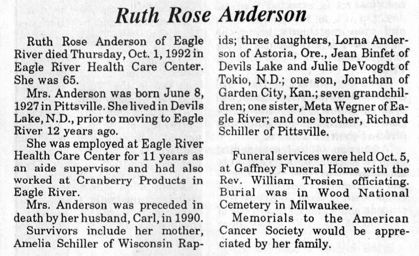 | Anderson | Ruth Rose | 08 Jun 1927 | 01 Oct 1992 | V N-R | 07 Oct 1992 | 4 |