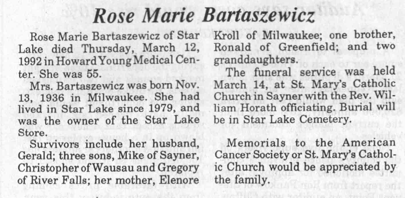| Bartaszewicz | Rose Marie | 13 Nov 1936 | 12 Mar 1992 | V N-R | 18 Mar 1992 | 4 |