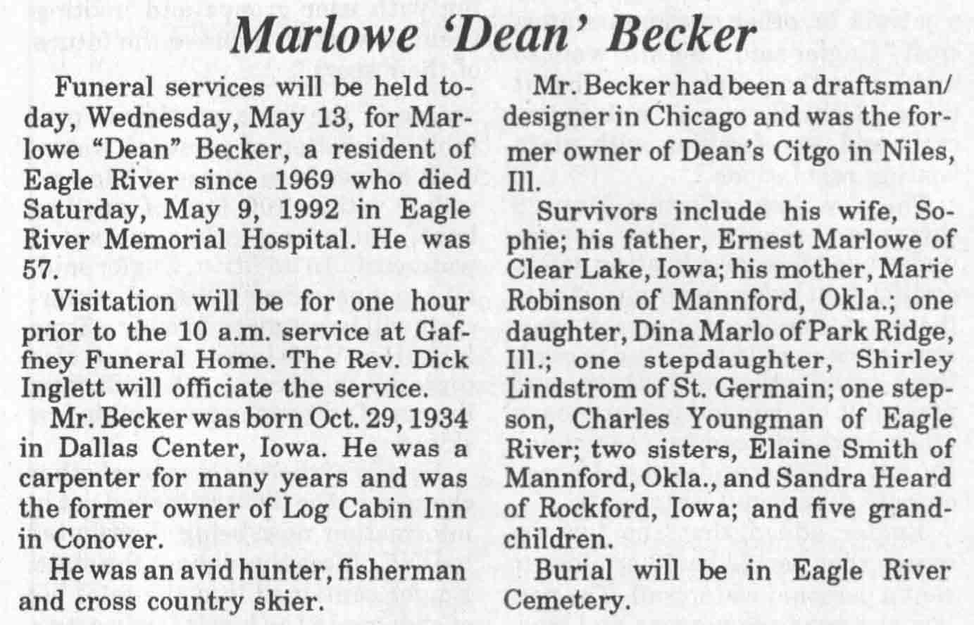 | Becker | Marlowe 'Dean' | 29 Oct 1934 | 09 May 1992 | V N-R | 13 May 1992 | 4 |
