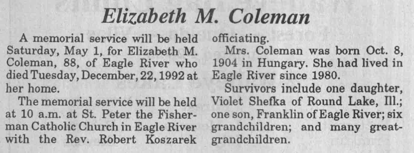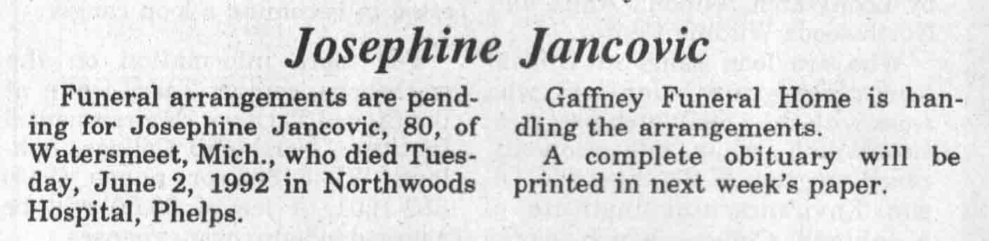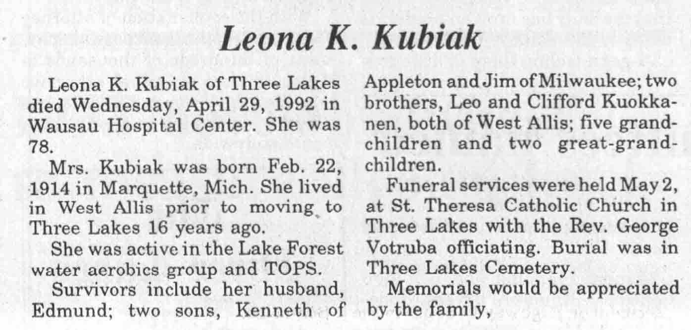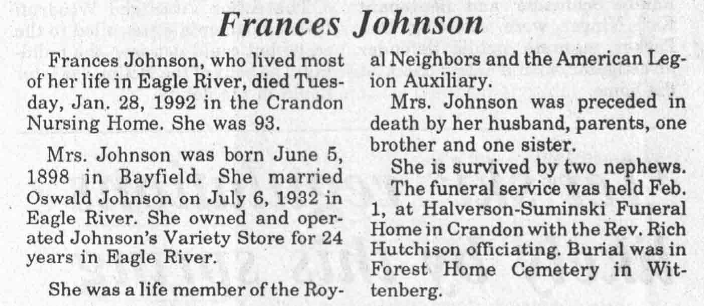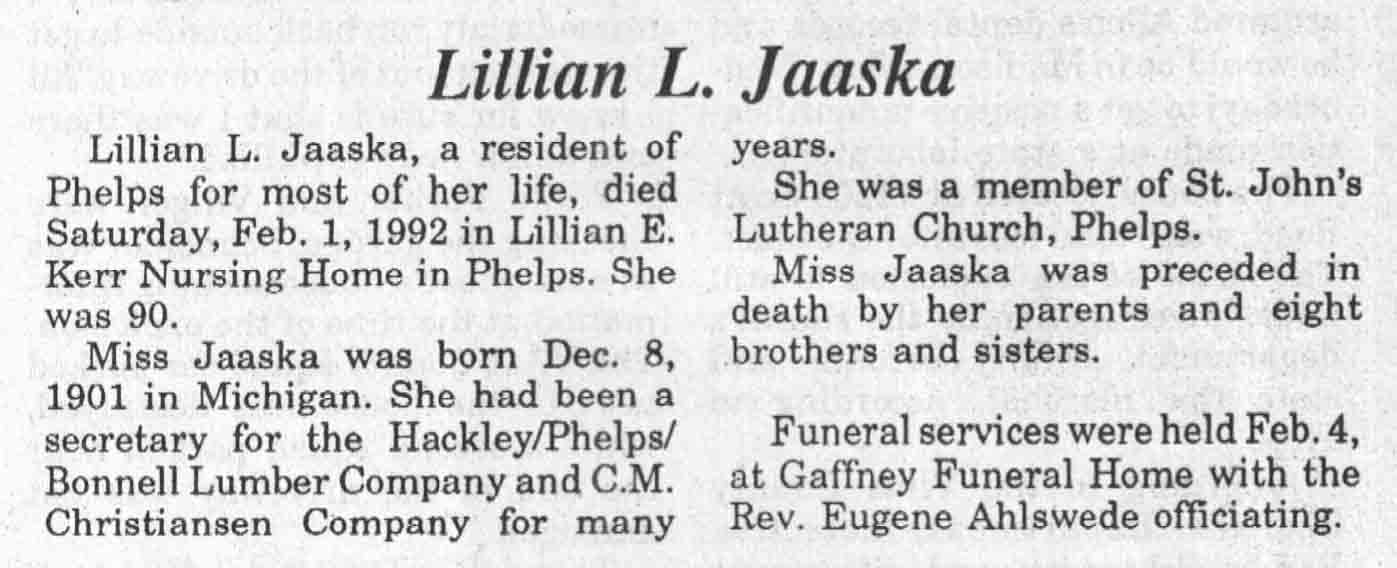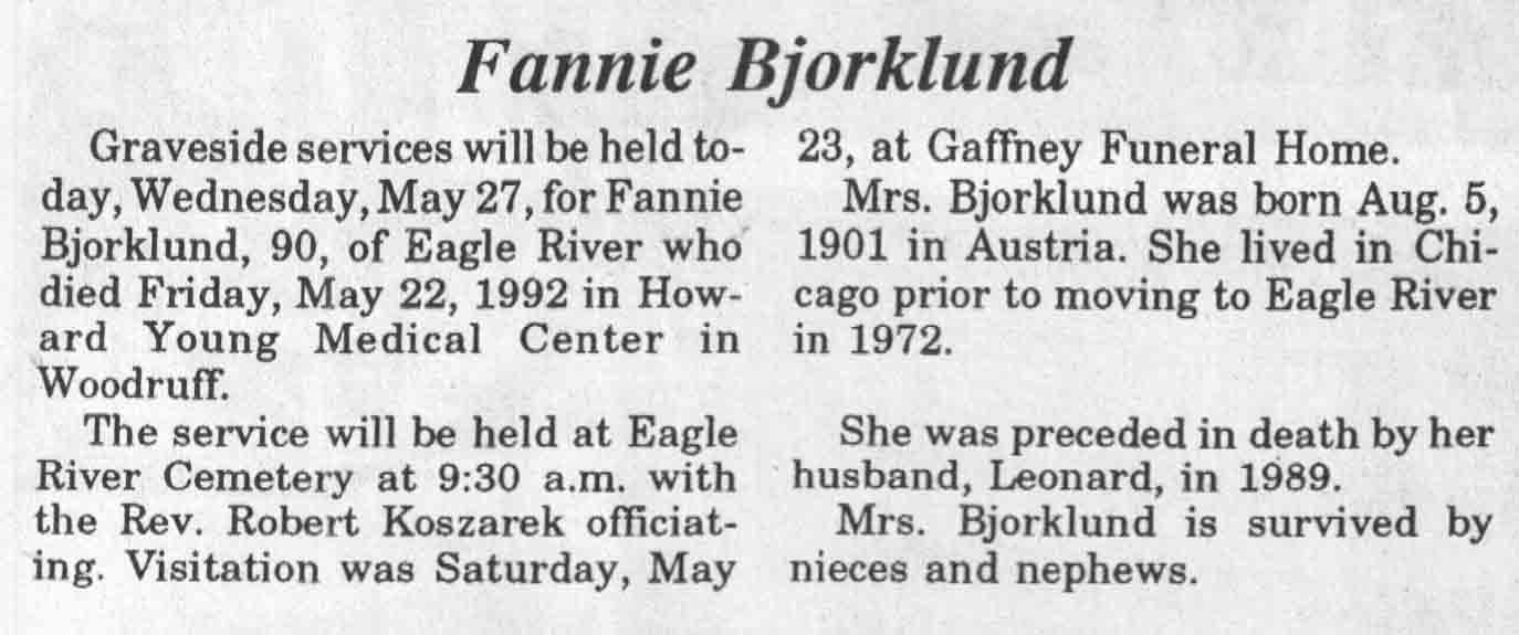 | Bjorklund | Fannie | 05 Aug 1901 | 22 May 1992 | V N-R | 27 May 1992 | 4 |