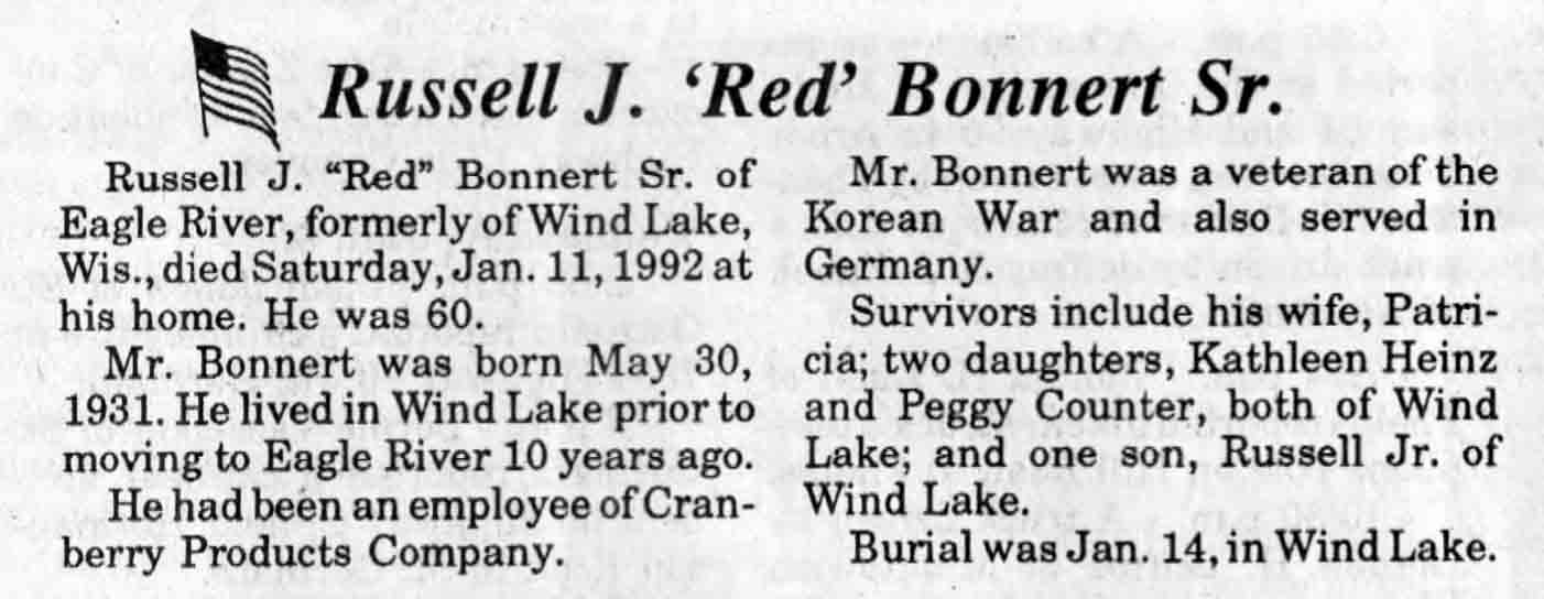 | Bonnett | Russell J 'Red', Sr | 30 May 1931 | 11 Jan 1992 | V N-R | 15 Jan 1992 | 8 |