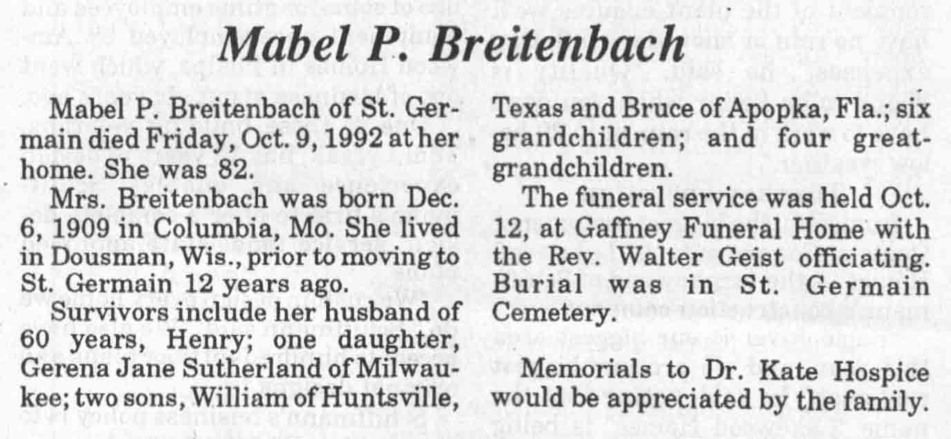 | Breitenbach | Mabel P | 06 Dec 1909 | 09 Oct 1992 | V N-R | 14 Oct 1992 | 4 |