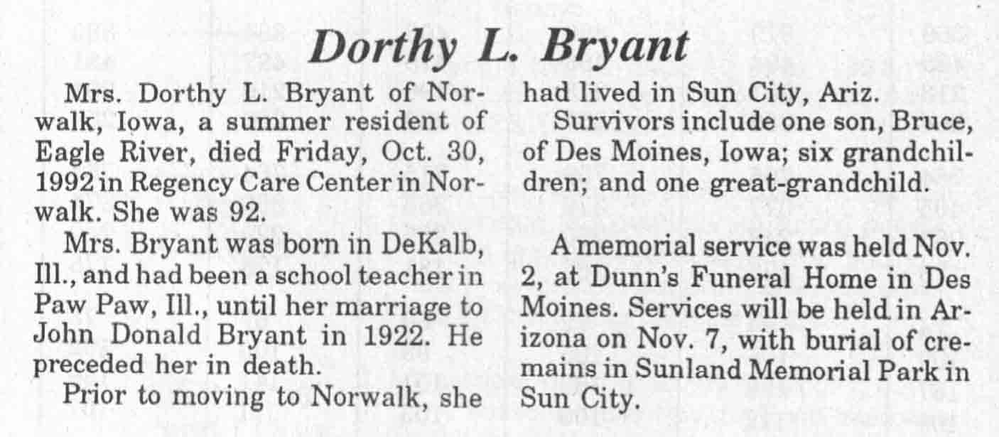 | Bryant | Dorthy L | c 1900 | 30 Oct 1992 | V N-R | 04 Nov 1992 | 4 |