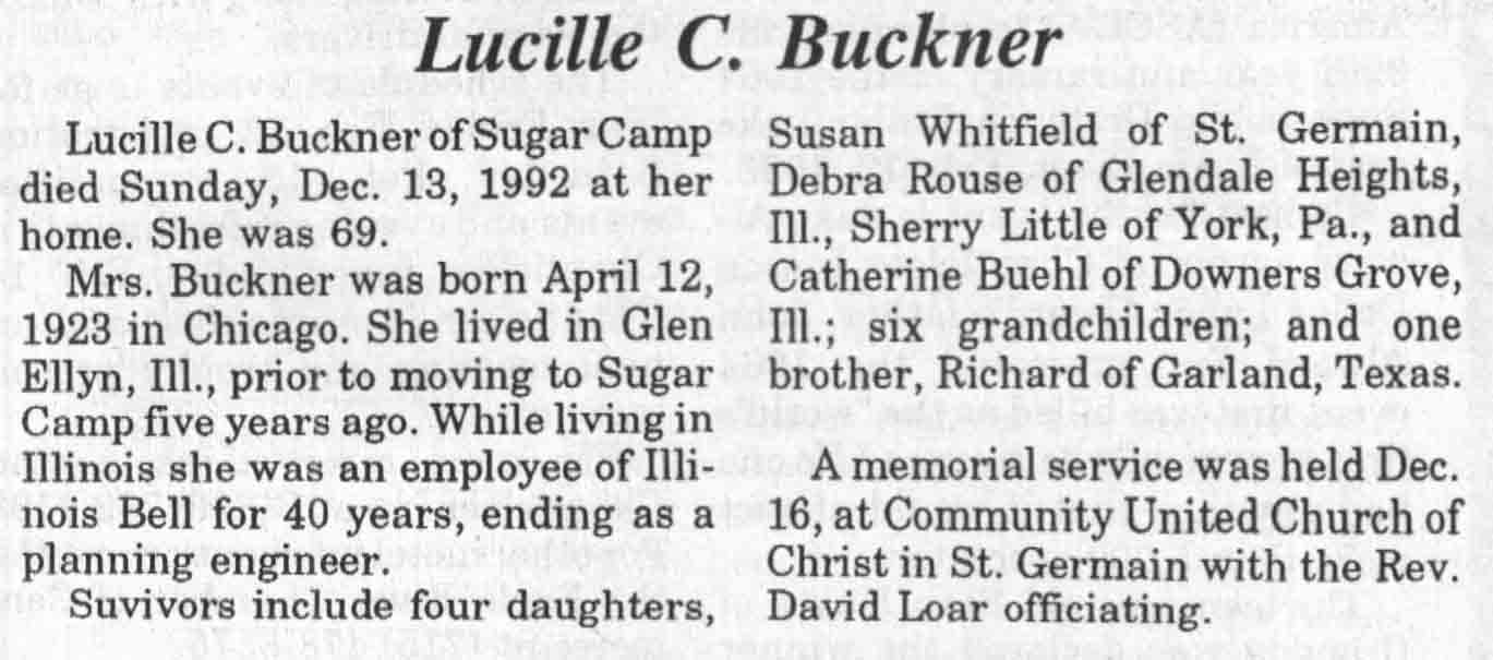 | Buckner | Lucille C | 12 Apr 1923 | 13 Dec 1992 | V N-R | 23 Dec 1992 | 4 |