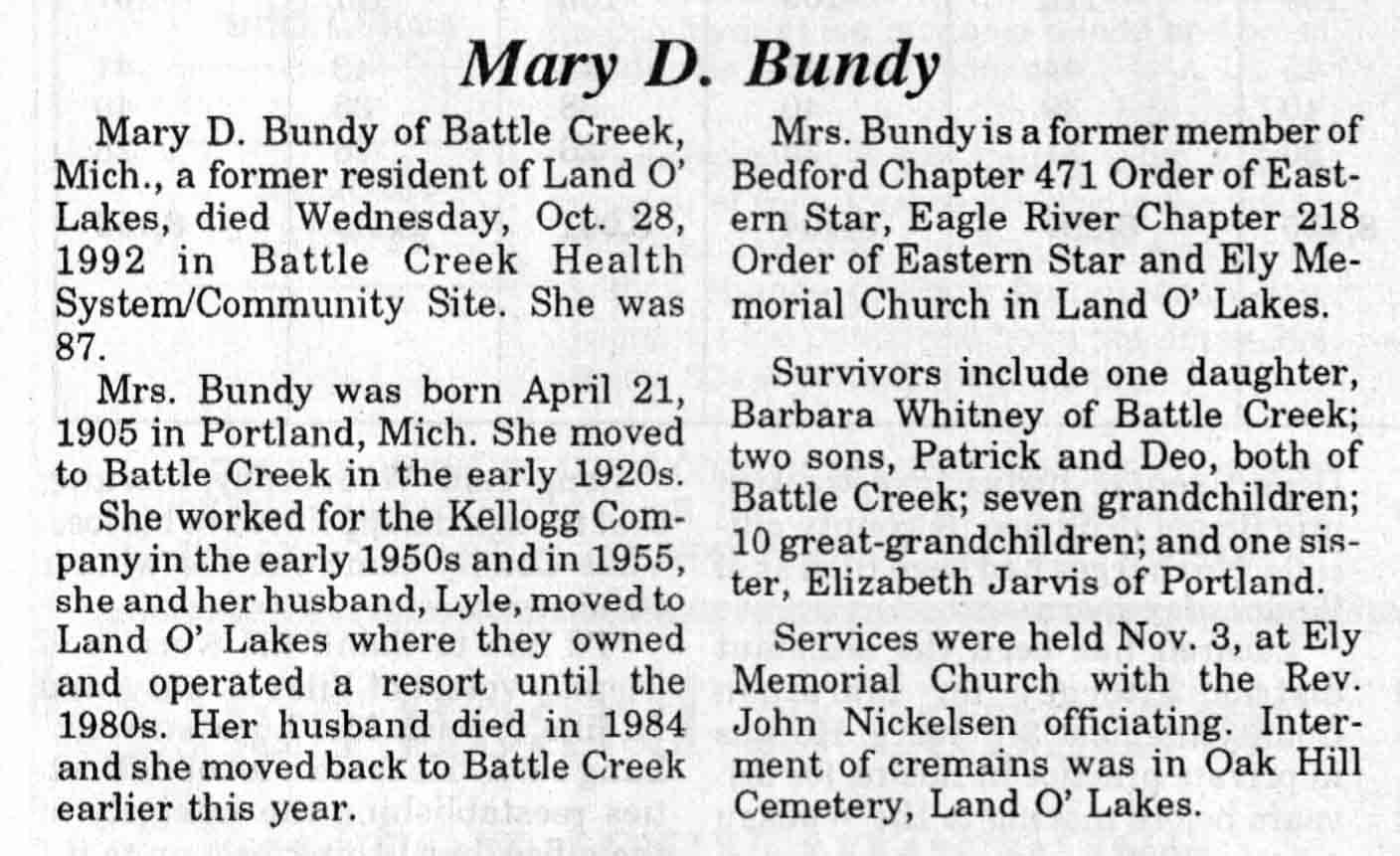 | Bundy | Mary D | 21 Apr 1905 | 28 Oct 1992 | V N-R | 04 Nov 1992 | 4 |
