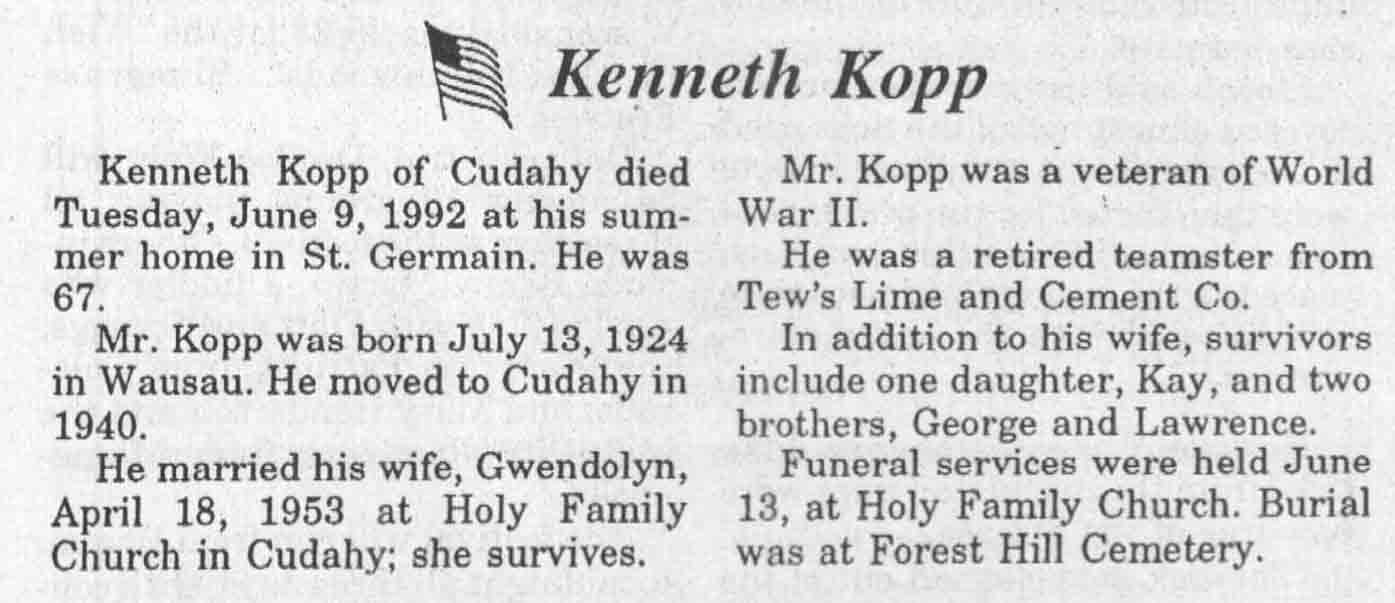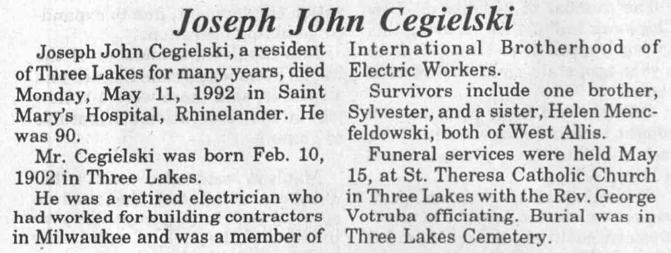 | Cegielski | Joseph John | 10 Feb 1902 | 11 May 1992 | V N-R | 20 May 1992 | 4 |